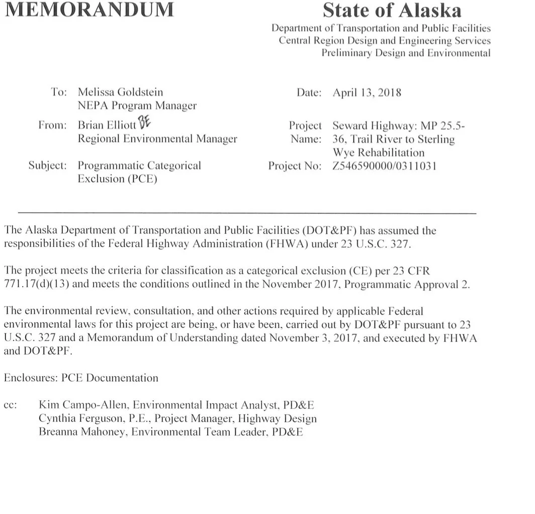 The Lodge owner and his staff have made numerous inquiries to lawyers, conservationists, State and Federal agencies in regard to the Categorical Exclusion given to this project in 2018 under a Memorandum of Understanding the DOT has with Federal Highway Administration and the Categorical Exclusion given to the Alaska DOT which we believe is woefully inaccurate considering all the changes in 2023 impacting Moose Pass. Our facts gathered by asking residents and knowing the land along with the wildlife provide the reasons for scrutinizing the DOT’s original application, which we believe based in facts, failed to present a full or accurate picture of the harms this town will befall if the road is widened.