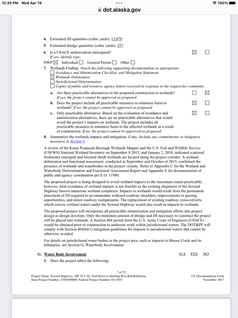 These basic forms with basic questions require more than a cursory answer and that these Memorandum of Understandings can be convenient but also wrong. We want an Environmental Impact Study because the information in 2018 omitted all the extraordinary impacts along with the community, culture, history, and habitat, salmon , and wetlands that will be harmed if the road is widened as planned, besides being a boondoggle. It appears this road has no real real justifiable reason, except to spend our money, while destroying private property, a community, a culture, salmon streams, bears, moose and eagle habitat ion context to the projects being dumped upon Moose Pass residents all at once.